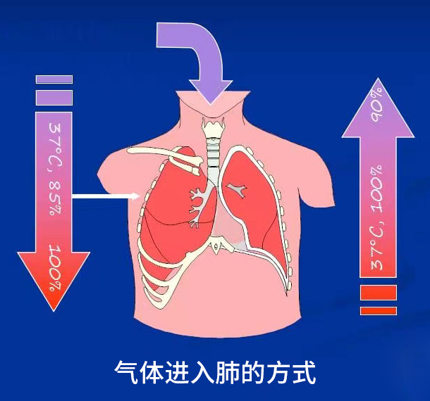 在健康的氣道中,吸氣時(shí),上氣道會(huì)對(duì)氣體進(jìn)行加溫濕化。當(dāng)氣體到達(dá)肺部時(shí),其溫度為核心體溫并且被水蒸氣充分飽和,也就是典型的,溫度為 37 °C,絕對(duì)濕度 (AH) 為 44 mg/L。