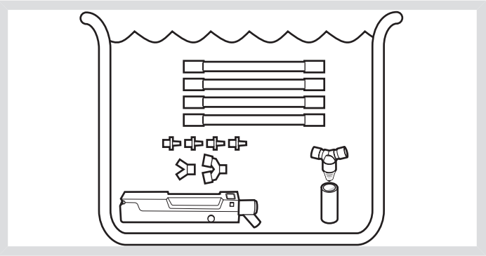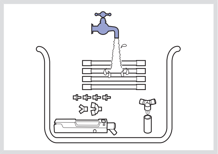 - 在水中徹底漂洗各部件以除去所有殘留的消毒劑。讓水從各部件中流過。